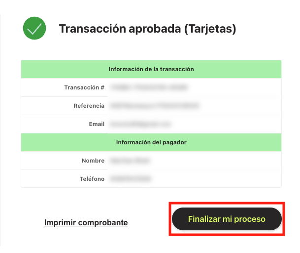 Después de realizar su pago, no olvides darle clic en "Finalizar mi proceso"